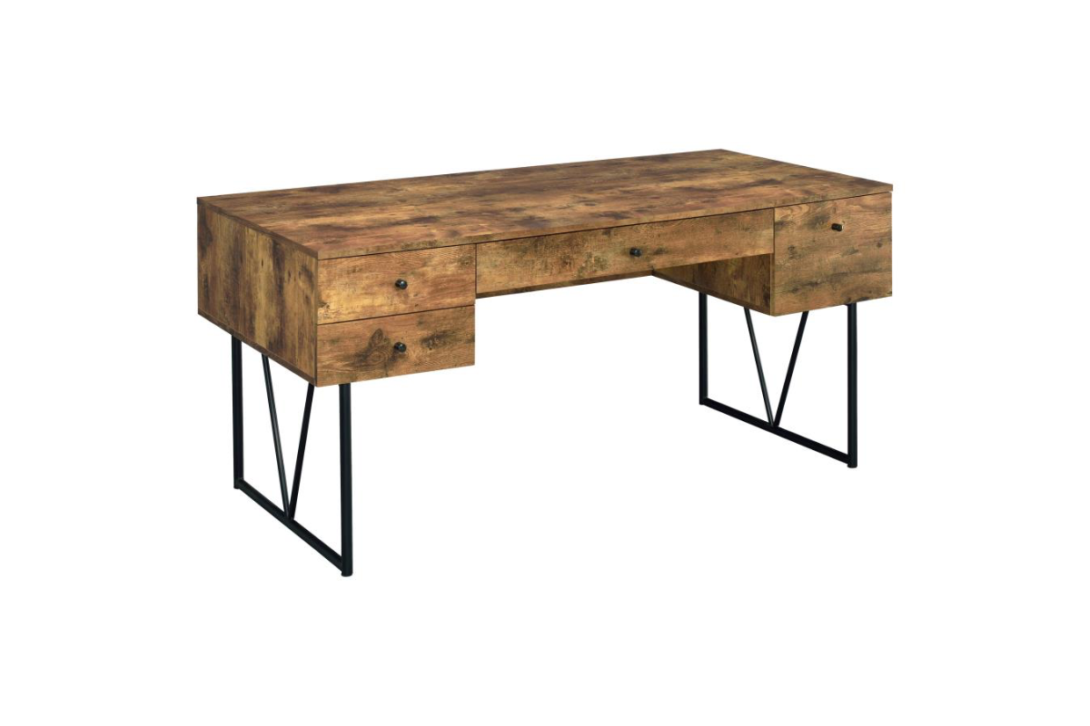 Rustic and inviting, this writing desk brings a blend of motifs. Minimalist styling delivers a crisp, clean look for a modern space. Antique nutmeg finish creates an earthy look for a desk unit with plenty of room. Full extension glides on its four drawers deliver smooth operation. A black metal base with a geometric pattern changes up its basic look and offers a hint of industrial styling.
