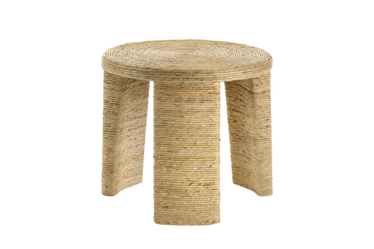 Soothing island vibes bring a relaxed coastal feel to your living space with this round end table, ideal for beach cottages or urban lofts alike. Woven rattan and banana leaf over a mahogany and plywood frame offer tropical texture and lasting durability. Three bracket-style legs enhance stability, while the round top provides ample space for decor or essentials. A natural finish highlights its organic charm, making it a versatile accent table that’s both timeless and tasteful.