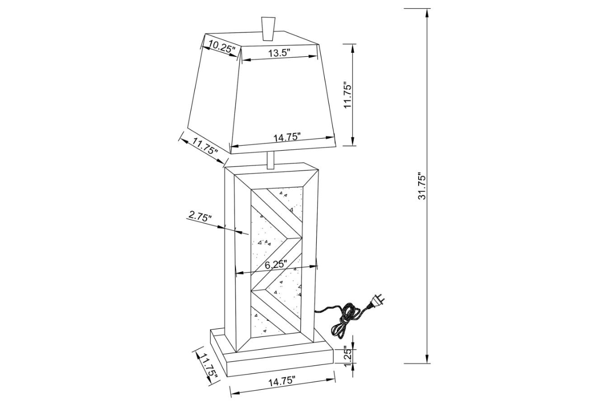 This statement-making table lamp features a rectangular base adorned with mirrored paneling and a bold chevron design inlaid with crushed crystal acrylic. A crisp white shade balances the shimmering base with a clean, structured silhouette. The geometric accents and reflective surfaces create a dramatic focal point for living rooms, bedrooms, or entryways. Designed to dazzle, this lamp adds ambient lighting with a touch of glam-inspired sophistication.