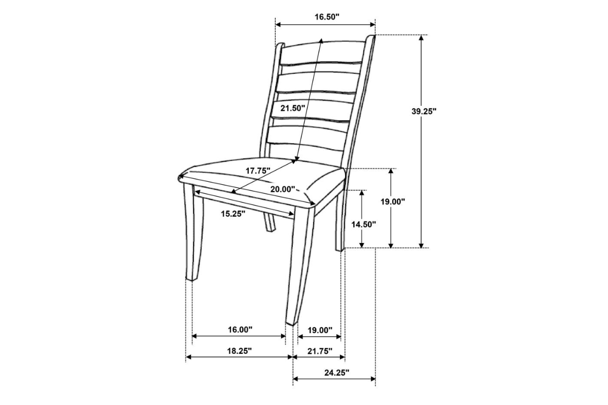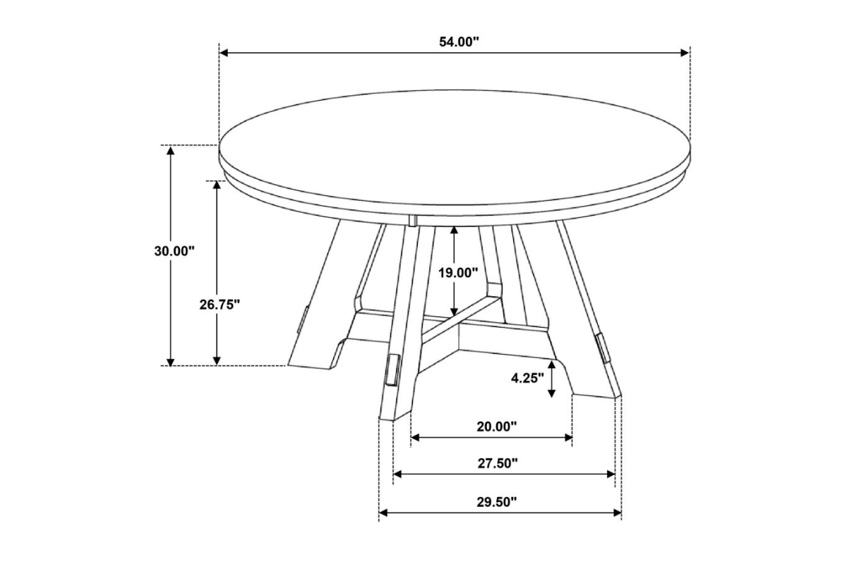Infuse your kitchen or dining room with the inviting warmth of a modern farmhouse dining set that includes a round table and four side chairs. The set is designed for casual enjoyment and vintage style, complete with a starburst wedge veneer pattern on its charming tabletop. The base of the table adds thick supports, including flared legs and crossing stretchers enhanced with joinery details. The set is ideal for a compact space, seating four comfortably with its 54-inch tabletop diameter. Its brown oak wood finish extends to four side chairs, each with a ladderback and padded seat covered in latte finish upholstery for a versatile look.