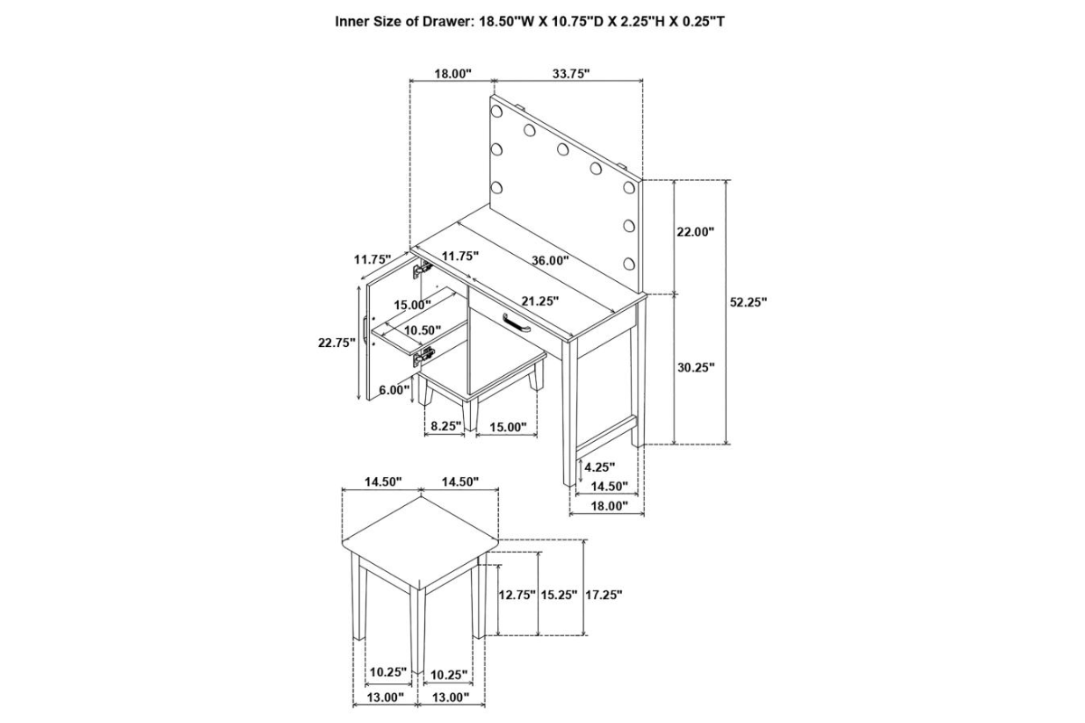 Includes: One (1) vanity table, one (1) mirror, and one (1) stool