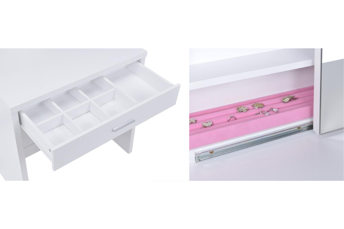 Contemporary white vanity looks great in a modern-style bedroom or dressing room and comes designed to hold your secrets better than a BFF. Pull-out drawer is spacious and compartmentalized for organization to get ready in a hurry (on those rare occasions). The large mirror slides open to reveal concealed jewelry storage compartments. Upholstered stool opens to reveal yet another storage area. This vanity truly is a woman's best friend.