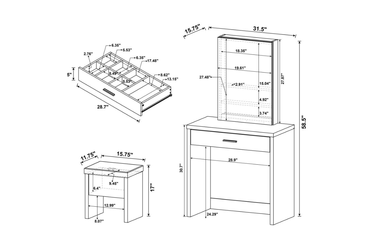 Includes: One (1) vanity table, one (1) mirror, and one (1) stool