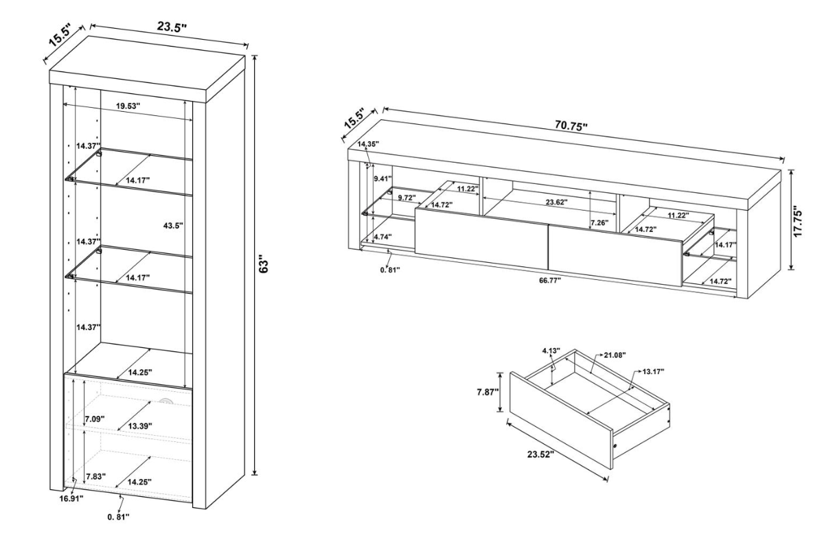 Elevate your entertainment arena with our sleek, modern TV stand. Drenched in a pristine glossy white-on-white finish, it radiates sophistication, accentuated by clear glass details. Its soft-close drawers ensure smooth operation, while glass shelves present a chic display option. Generous storage compartments cater to all your media needs. To enhance the ensemble, the set comes with matching media towers, amplifying storage capacity and offering a unified, stylish appearance. This combo not only meets functional demands but also serves as a captivating focal point in any contemporary space.