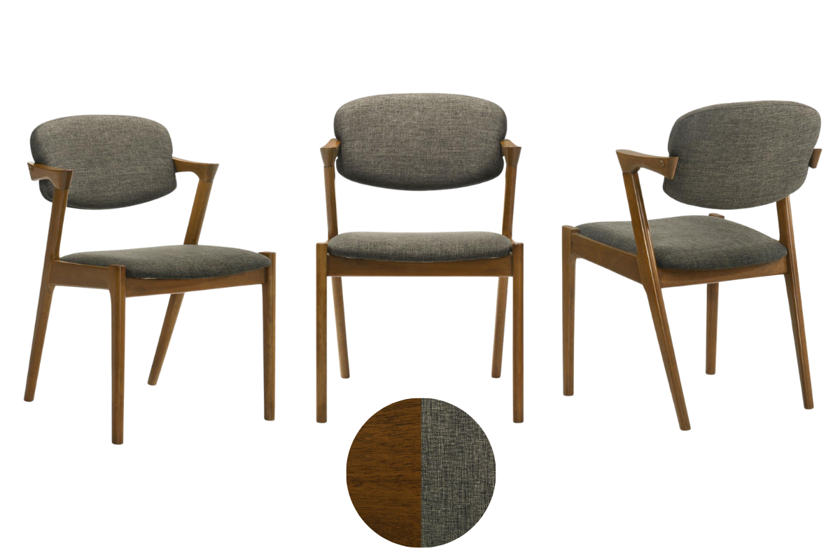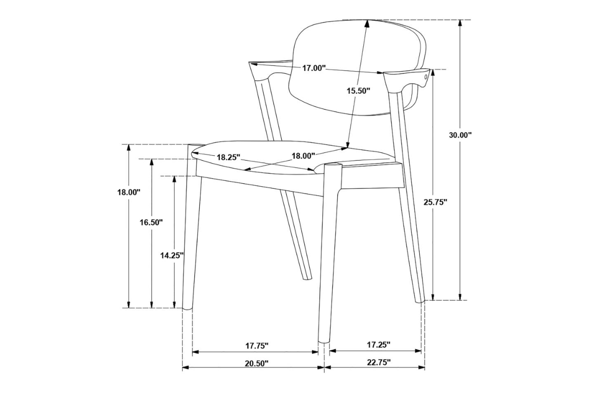 Craft a modern motif with the clean lines and retro-like feel of this five-piece dining set. Mid-century modern design gets a contemporary makeover with overtly angled details. Thin, tapered legs and angles marry on both the table and four side chairs. Open and visually interesting, the chairs feature warm brown upholstery along the seat and back. Charming details and design create a clean set that looks great in large and small spaces.