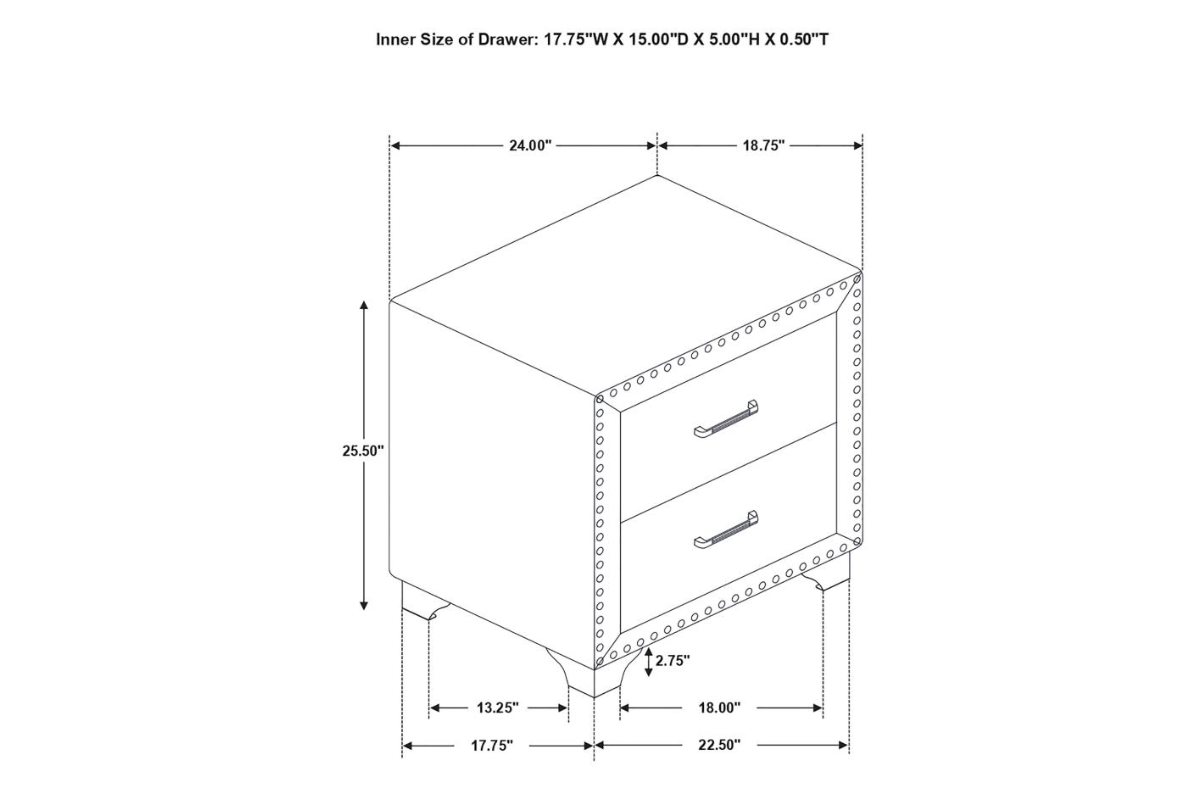 You've never seen furniture so elegant until this nightstand entered the picture. Entirely upholstered in velvet, this nightstand is a conversation starter. It has two spacious drawers to store your bedside items. Nail head trim makes a glorious statement that matches the tapered legs. With its stunning and regal design, this nightstand will make your sleeping space feel like royalty.