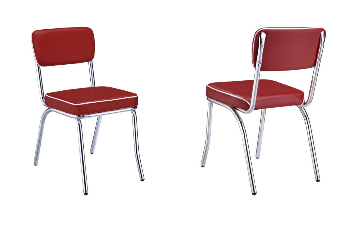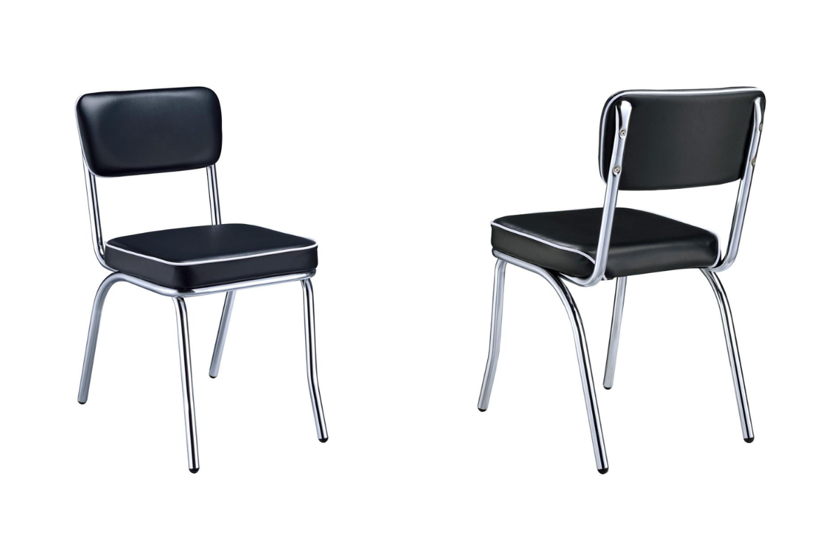 Travel back in time to an easy era where soda shoppes served as social centers. This five-piece dining set features a classic round dining table with a metal ellipse edge profile and shiny top. A decadent flared metal base is open and airy, matching the design of coordinating chairs. Fabric upholstery covers thick seat cushions and slender backs, with piping details creating a bit of dimensionality. Make this dining set part of an overall design scheme that fits your unique style.