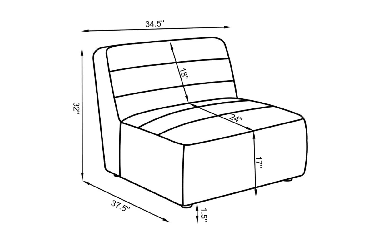 This modular armless chair offers the perfect combination of comfort and versatility. The plush, deep cushioning ensures long-lasting support while the channel-tufted backrest adds a touch of refinement to any space. Whether you use it as a standalone piece or as part of a larger sectional, its modern design complements a wide variety of interiors. Designed for flexibility, this chair can be seamlessly integrated into various room layouts, making it a practical addition to any home.