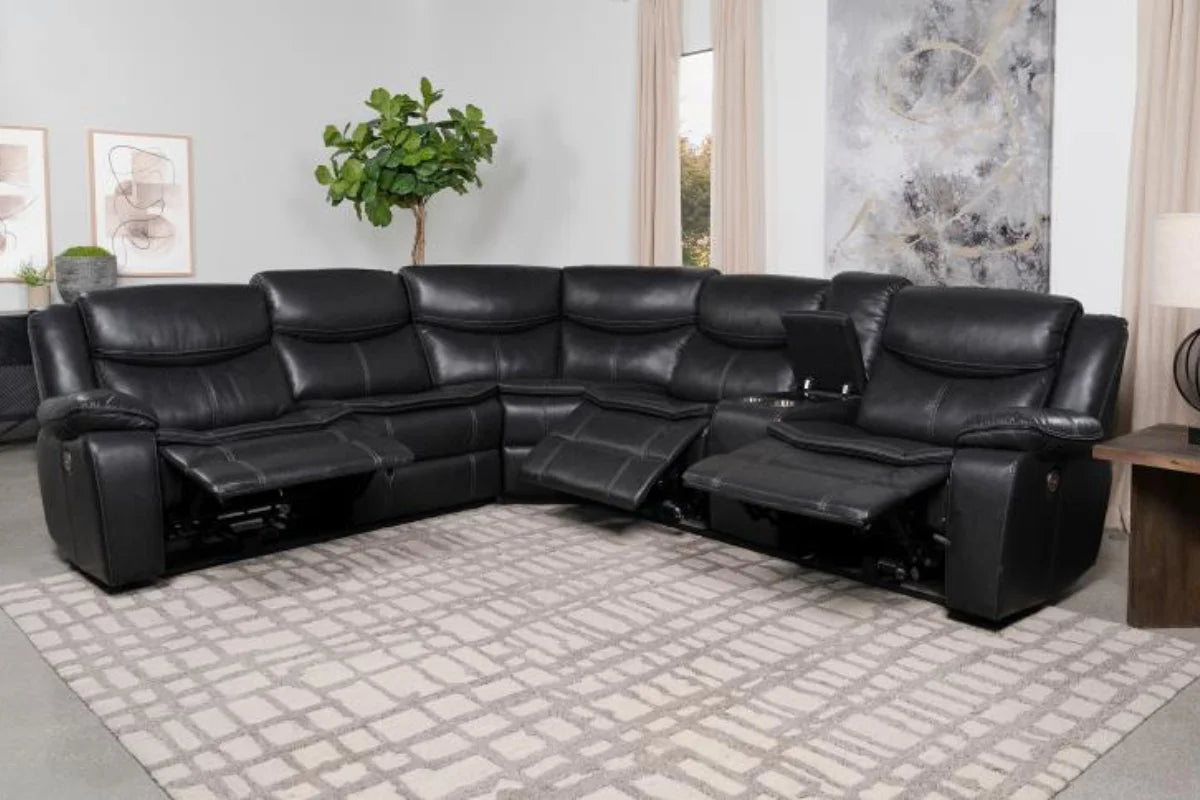 Bring modern comfort and convenience into your living space with this power reclining sectional. Designed with a rounded silhouette and rich leatherette upholstery, it offers both style and durability. Plush foam filling with tufted and channeled detailing creates inviting comfort, while pocket coil seating with sinuous spring construction ensures lasting support. Smooth power recline functionality allows customized lounging, complemented by a wall-hugger design that saves space. A flip-top console with cup holders adds practical storage for everyday use.